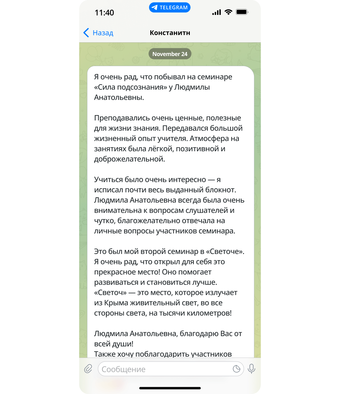 Это был мой второй семинар в «Светоче». Я очень рад, что открыл для себя это прекрасное место! Оно помогает развиваться и становиться лучше. «Светоч» — это место, которое излучает из Крыма живительный свет, во все стороны света, на тысячи километров!