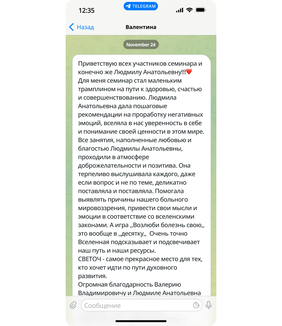 Для меня семинар стал маленьким трамплином на пути к здоровью, счастью и совершенствованию. Людмила Анатольевна дала пошаговые рекомендации на проработку негативных эмоций, вселяла в нас уверенность в себе и понимание своей ценности в этом мире. Все занятия, наполненные любовью и благостью Людмилы Анатольевны, проходили в атмосфере доброжелательности и позитива. Она терпеливо выслушивала каждого, даже если вопрос и не по теме, деликатно поставляла и поставляла. Помогала выявлять причины нашего больного мировоззрения, привести свои мысли и эмоции в соответствие со вселенскими законами. А игра, Возлюби болезнь свою, это вообще в, десятку, Очень точно Вселенная подсказывает и подсвечивает наш путь и наши ресурсы.