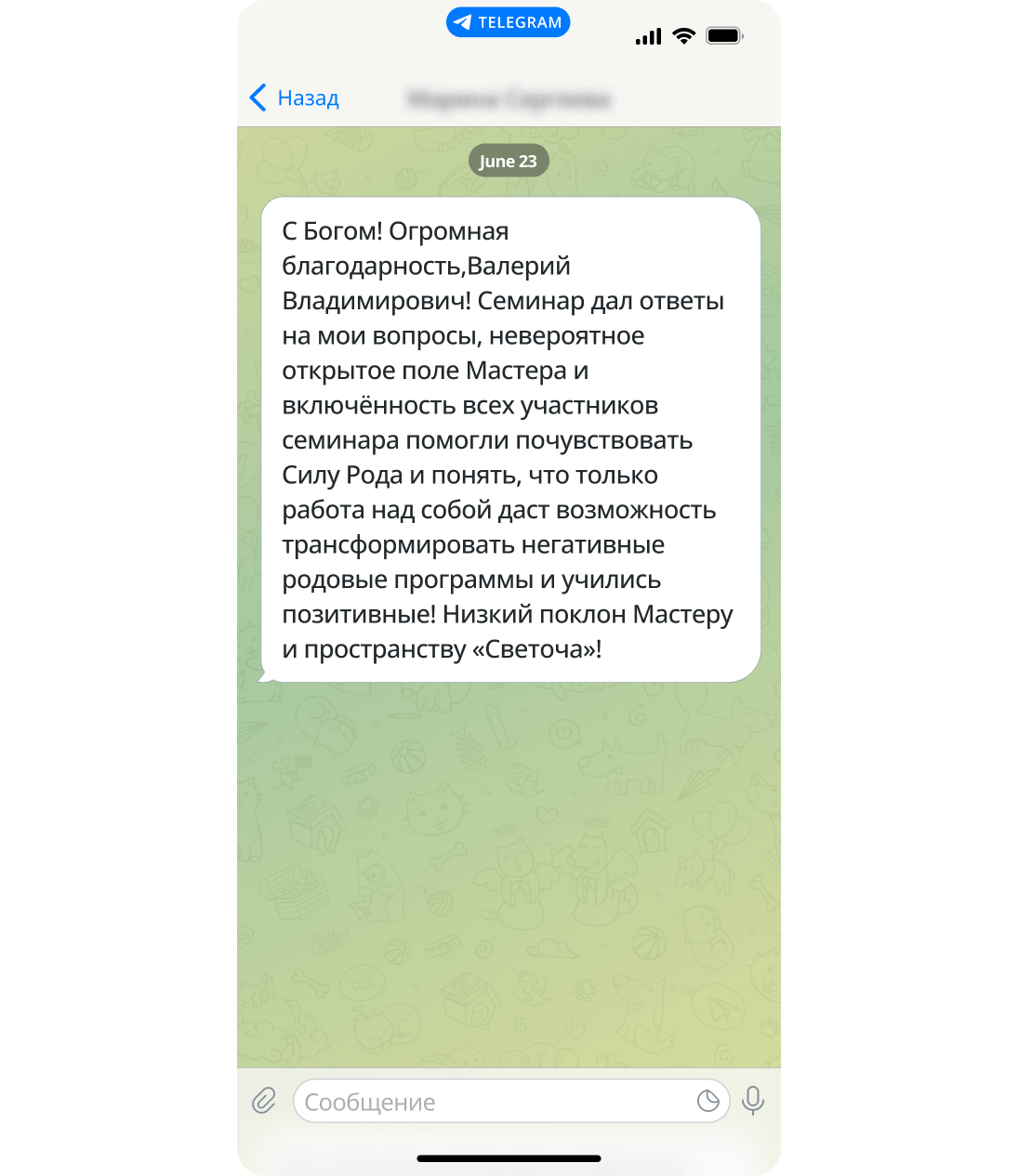 С Богом! Огромная благодарность, Валерий Владимирович! Семинар дал ответы на мои вопросы, невероятное открытое поле Мастера и включённость всех участников семинара помогли почувствовать Силу Рода и понять, что только работа над собой даст возможность трансформировать негативные родовые программы и научиться позитивным! Низкий поклон Мастеру и пространству «Светоча»!