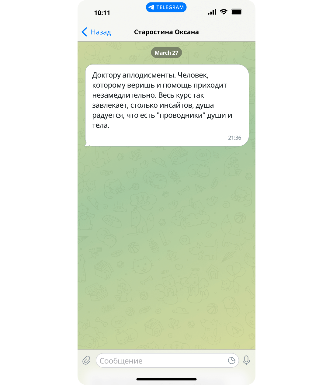 Доктору аплодисменты. Человек, которому веришь и помощь приходит незамедлительно. Весь курс так завлекает, столько инсайтов, душа радуется, что есть «проводники» души и тела.