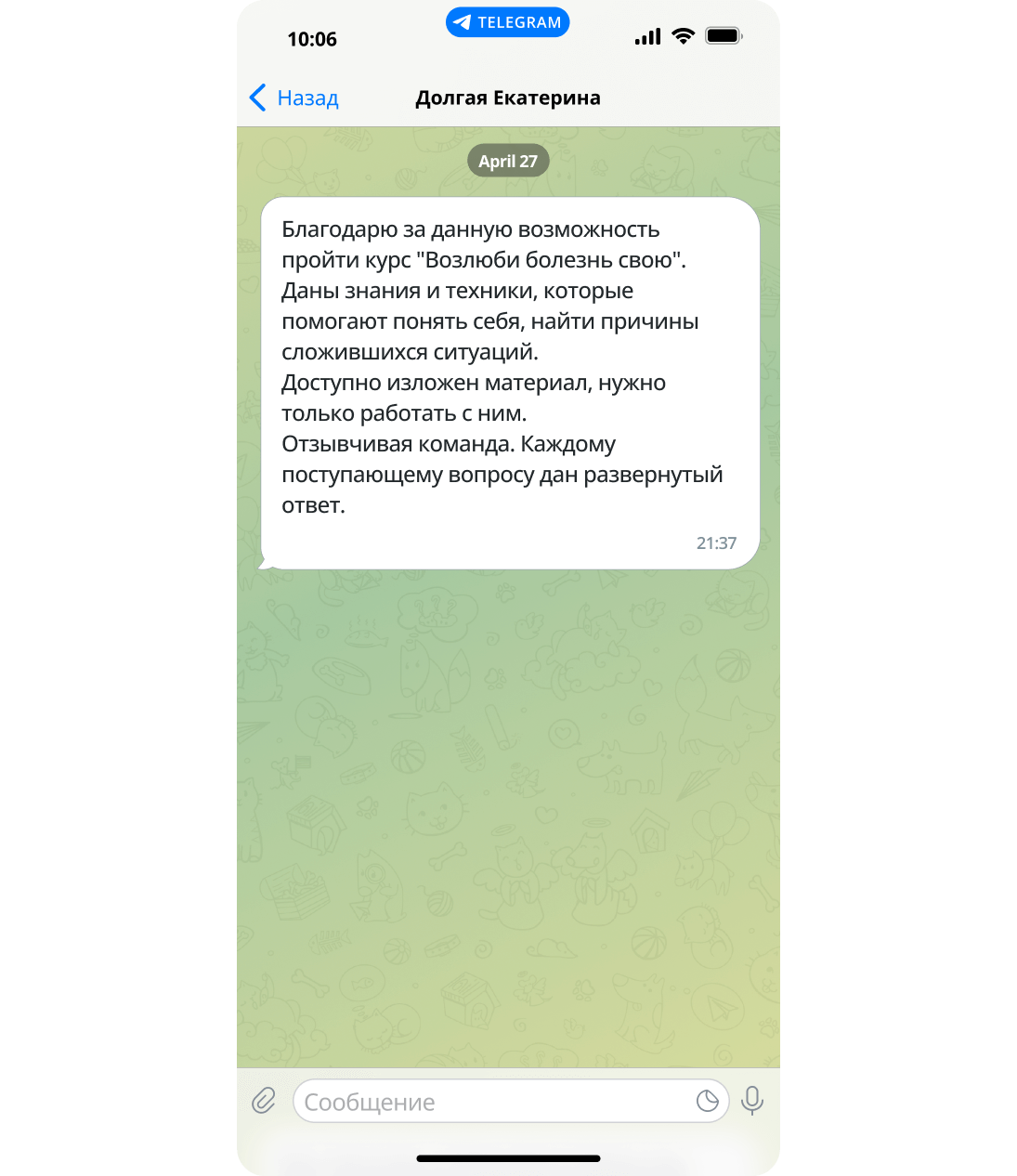 Благодарю за данную возможность пройти курс «Возлюби болезнь свою».