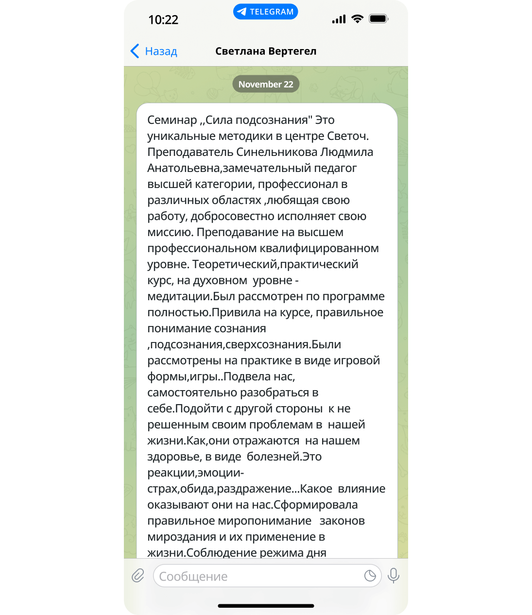 Семинар «Сила подсознания» — это уникальные методики в центре Светоч. Преподаватель Синельникова Людмила Анатольевна, замечательный педагог высшей категории, профессионал в различных областях, любящая свою работу, добросовестно исполняет свою миссию. Преподавание на высшем профессиональном квалифицированном уровне. Теоретический, практический курс, на духовном уровне — медитации. Был рассмотрен по программе полностью. Привила на курсе, правильное понимание сознания, подсознания, сверхсознания. Были рассмотрены на практике в виде игровой формы, игры. Подвела нас, самостоятельно разобраться в себе. Подойти с другой стороны к не решенным своим проблемам в нашей жизни. Как, они отражаются на нашем здоровье, в виде болезней. Это реакции, эмоции- страх, обида, раздражение… Какое влияние оказывают они на нас. Сформировала правильное миропонимание законов мироздания и их применение в жизни. Соблюдение режима дня, правильное питание, духовные практики-медитации. Обратила, особенно внимание каждого слушателя семинара, заглянуть внутрь себя. Пересмотреть, посмотреть выстроить новые модели мышления, поведения. Подойти правильно к своим установкам, убеждениям. Как правильно реагировать на реакции, эмоции. Как, изменить старые внутренние неэффективные программы, которые укоренились на протяжении многих лет. Заменить на новые модели поведения. Позитивные установки. Эффективно использовать и применять в жизни. Для чего, нам это, надо!!!)))Для повышения качества жизни))) Гармоничной слаженной работы всей системы организма))).Быть здоровыми, успешными, любящими, любимыми, радостными, добрыми, отзывчивыми, счастливыми. Просто наслаждаться жизнью))).Вдыхать любовь природы, выдыхать благодарность. Выражаю БЛАГОДАРНОСТЬ🙏 лично Людмилы Анатольевны❤️, Валерию Владимировичу и всему обслуживающему персоналу, за доброжелательное гостеприимство👍А, также БЛАГОДАРНОСТЬ от группы Атланты-Светлячки ❤️❤️❤️