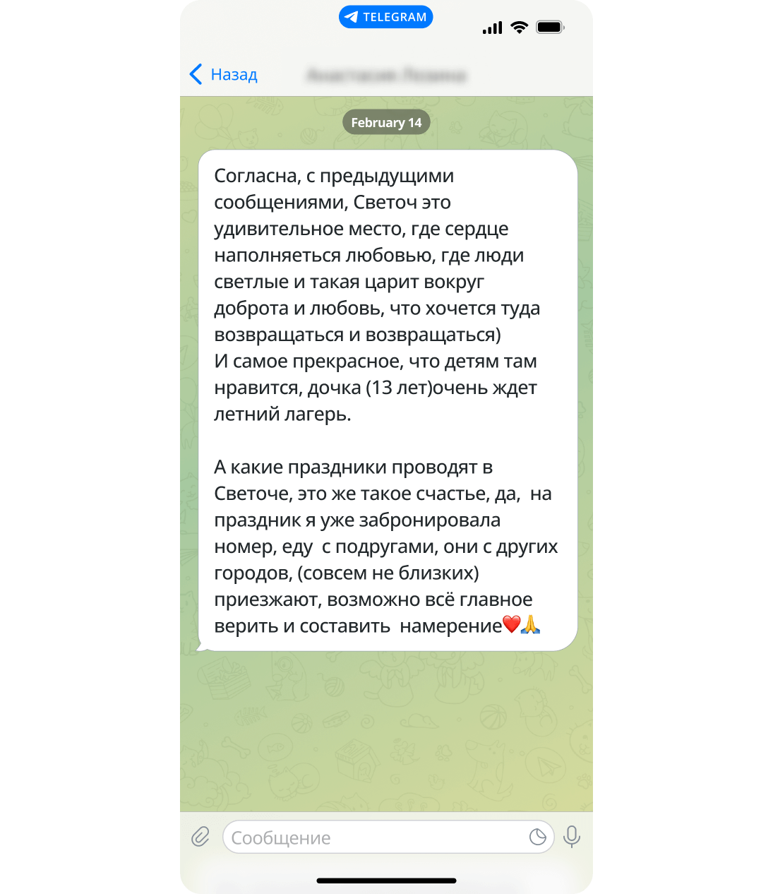 Согласна, с предыдущими сообщениями, Светоч это удивительное место, где сердце наполняеться любовью, где люди светлые и такая царит вокруг доброта и любовь, что хочется туда возвращаться и возвращаться)